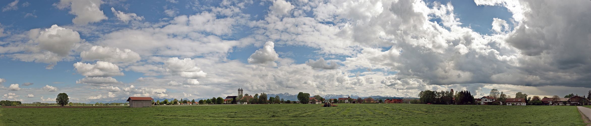 Nikon D700, 24-70/2,8 bei 44 mm. Die Kamera war auf dem Stativ auf einem von mir selbst gefertigten Panoramaadapter befestigt. Der Bildwinkel ist 175 x 57 Grad, 13 Einzelbilder im HF |
