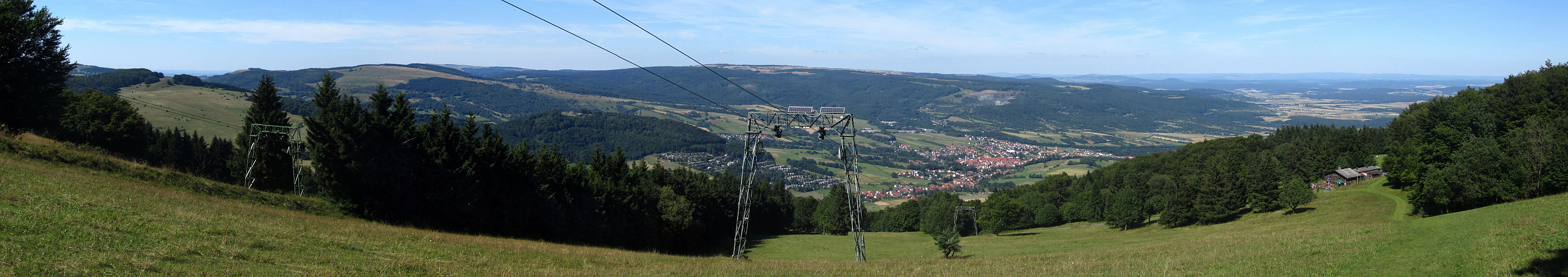 Der dritte gutsichtige Sommertag in Folge und ich hatte Zeit - das ist selten. Ich fuhr mit dem Rad von Riedenberg auf den Kreuzberg, den "Heiligen Berg der Franken". Es war ein Montag und der ansonsten stark frequentierte Berg daher nur wenig besucht. An keiner Stelle bietet der neben der Dammersfeldkuppe höchste Berg Unterfrankens eine komplette Rundumsicht, aber es gibt mehrere Aussichtsstellen. Den besten Blick nach Nordosten auf Bischofsheim und zum Thüringer Wald hat man oberhalb der Gemündener Hütte. Hier findet man auch ideale Bedingungen, um über die Frage nachzudenken, ob einem Liftanlagen im Blickfeld gefallen oder nicht.