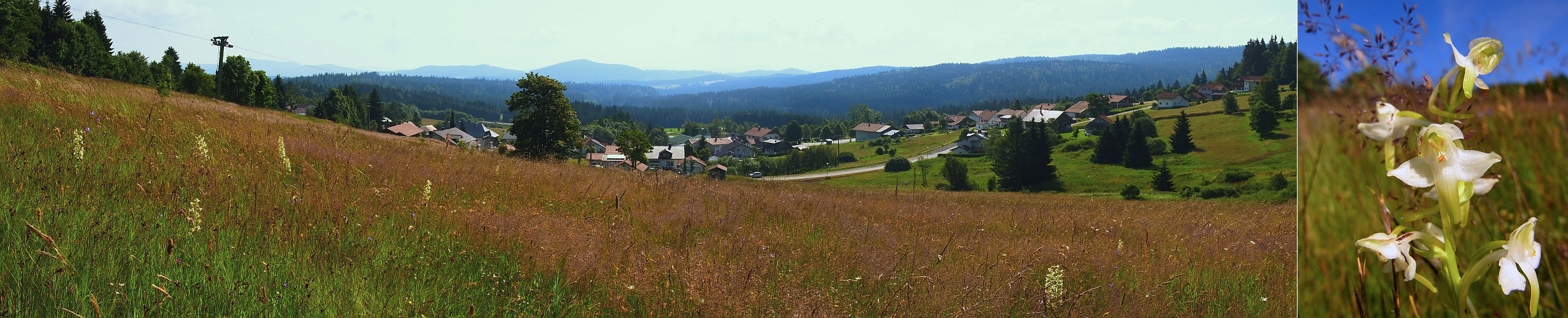 Die Weiße Waldhyazinthe (auch Zweiblättrige Kuckucksblume, Platanthera bifolia) ist eine in Deutschland noch recht häufige Orchidee. Sie blüht meist in der ersten Junihäfte, in den letzten Jahren oft schon im Mai. Es gibt aber auf saurem Boden eine spätblühende Sippe, die manchmal als Subspecies graciliflora bezeichnet wird (z.B. in Presser, Orchideen, Nikol-Verlag Hamburg 2002). Wie immer bei Biotopbildern gebe ich den Standort zum Schutz der Pflanzen nicht an. Gebietskenner werden aber vielleicht das im Bild sichtbare Dorf identifizieren können. Panorama: 7 QF-Aufnahmen, freihand, Brennweite 48mm KB, 1/1230 sec, f 4,3; Nahaufnahme:Brennweite 30mm KB, 1/500 sec, f 7,6.