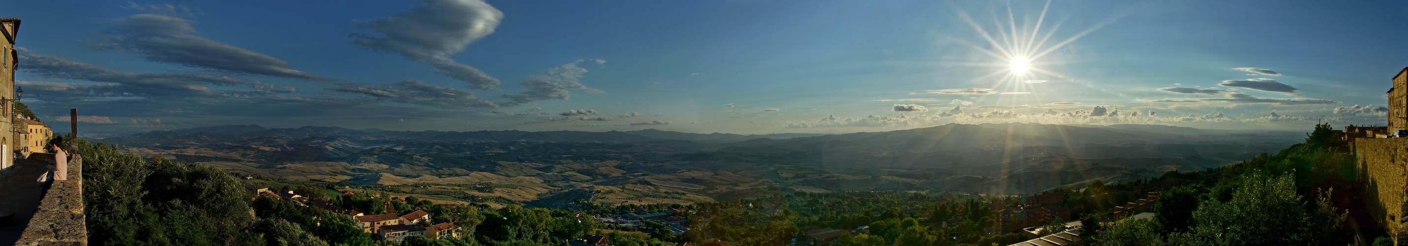Volterra liegt etwa 50 Kilometer südlich von Pisa und 50 Kilometer vom Mittelmeer entfernt. Die Stadt gilt mit ihrem spektakulären landschaftlichen Umfeld als eine der schönsten in der Toskana. Der Kern der heutigen Stadt liegt abgeschieden auf einem 550 m hohen Bergrücken über dem Tal der Cecina (Val di Cecina) inmitten einer kargen, zerfurchten Hügellandschaft. Die Felsabbrüche und Geröllhalden sind das Produkt jahrhundertelanger Erosion. Das Gebiet Le Balze im Nordwesten Volterras vermittelt einen beispielhaften Eindruck dieses Phänomens. Die Stadt wird beherrscht von einer heute als Staatsgefängnis benutzten Festung der Medici. Volterra ist ein Zentrum der Alabasterverarbeitung. Volterra kann auf eine lange Geschichte zurückblicken; bereits im 4. Jahrhundert v. Chr. entstand der Ort aus der Verbindung mehrerer kleiner etruskischer Ansiedlungen, deren Bestand bis ins 7. Jahrhundert v. Chr. zurückverfolgt werden kann. Zu dieser Zeit bauten die Etrusker eine sieben Kilometer lange Ringmauer und nannten die nunmehr vereinigte Stadt Velathri. Volterra war eine der ältesten und größten der zwölf Bundesstädte Etruriens. Später war es eine römische Stadt mit den Rechten eines Municipiums. Ihre hohe Lage machte sie zu einer starken Festung, die Sulla im ersten Bürgerkrieg erst nach zweijähriger Belagerung 79 v. Chr. einnehmen konnte. Im 12. und 13. Jahrhundert war Volterra eine Republik; im 14. Jahrhundert fiel es an Florenz. Aus Wikipedia 4QF-HDR-Handaufnahmen 20mm (x1,5), Alpha 77, Sigma 20, LR, Hugin, PSE, nach Hugin 224º 48º, 19:08 Uhr Bei der Beschriftung tue ich mir noch recht schwer... |