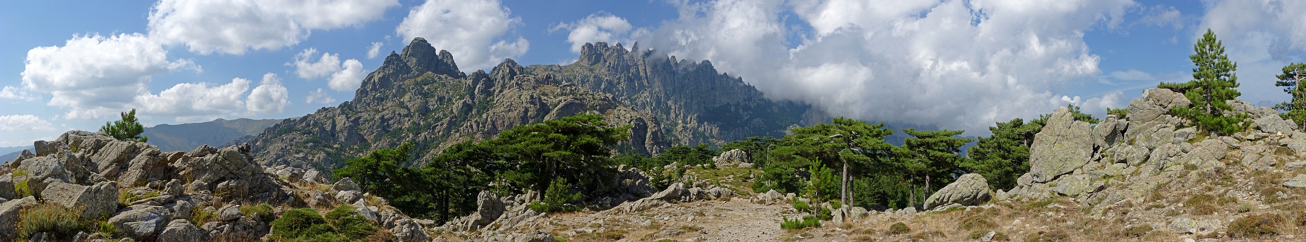 Hans-Jörg Bäuerle hat geschrieben, dass er sich auf die Fotos von der Bavella-Gruppe freuen würde, die ich in meiner Korsika-Serie noch versprochen hatte, insbesondere die der roten Felsen. Damit kann ich leider nicht dienen, an diesem frühen Nachmittag präsentieren sich die Spitzen der Bavella Nord eher in dolomitigem Grau; ein Umstand, der immerhin dazu geführt hat, dass diese Spitzen ganz im Süden der Insel, die die 2000 m nicht mehr erreichen, als die Dolomiten Korsikas gelten. Wie in den südlichen Dolomiten kämpft man als Fotograf auch hier mit zahlreichen Quellwolken. Diesmal, so finde ich, stören sie nicht.