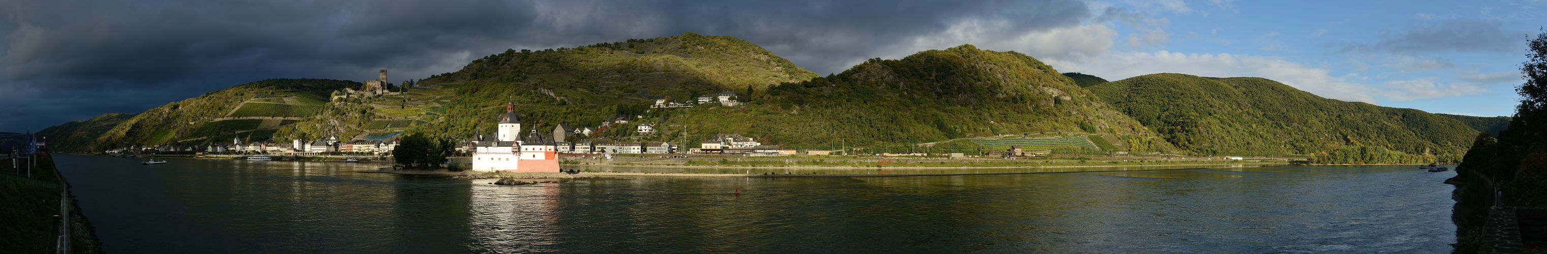 Bei diesem Pano hatte ich mit den Lichtverhältnissen viel Glück. Ein Regenschauer auf der einen Seite, die Sonne auf der anderen und Kaub mit der Pfalz genau dazwischen. Blieb nur noch den richtigen Moment abzuwarten, bei dem die Pfalz, die Burg Gutenfels und Kaub in der Sonne lagen. Das "Lichtspiel" dauerte nur wenige Minuten, danach war die Sonne weg.