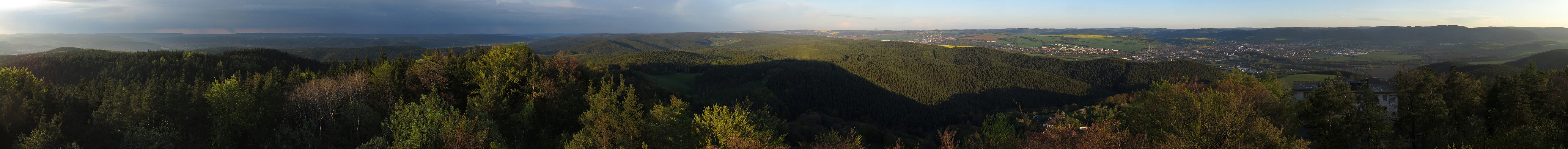 Auf dem 481m hohen Kulm bei Saalfeld steht ein 130 Jahre alter Stahlgitteraussichtsturm, der immer frei zugänglich ist. Dicht daneben ist noch ein Funkturm, der ein 360 Grad-Pano verhindert. In dieser Richtung hatte ich aber auch grelles Gegenlicht. Zwischen zwei kräftigen Regenschauern kam die Sonne noch mal durch die Wolken uns sorgte für schönes Licht.