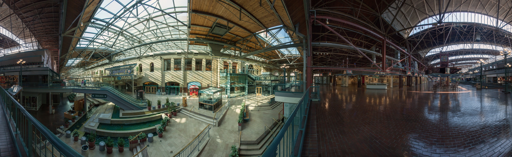 Noch etwas schwieriger gestaltete sich diese Aufnahme im Innenbereich des Bahnhofs. Zu sehen ist im linken Bildteil das Headhouse mit Midway (hier im frei zugänglichen Bereich) und zur rechten der frühere Gleisbereich der zu einer kleinen Shopping Mall umgebaut wurde. Alles leer wie man sieht ...