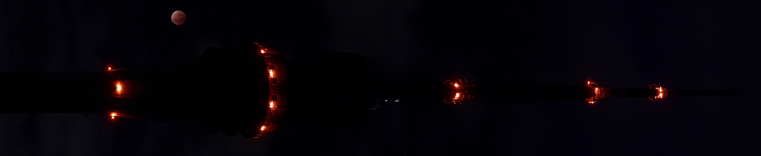 Eigentlich hatte ich der Mondfinsternis erst gar keine Bedeutung beigemessen, denn der Mond kann zum Auf oder Untergang bei entsprechender Wetterlage ähnlich aussehen. Somit war das eher eine last minute Aktion mit einer dafür völlig ungeeigneten Kamera. Zunächst also erst einmal überlegt, welches Gebäude bei 20° Elevation noch geeignet ist. Hin kommen muss man auch noch und dunkel soll es natürlich auch sein. Kurz mal Pythagoras und googleearth bemüht und der Standort stand schnell fest. Der Fernsehturm bietet auch genügend Reserven, um den Standort etwas zu wechseln. Nächstes Problem: bei 200mm ist es bei meiner Kamera unmöglich die 500'er Regel einzuhalten um den dunklen Mond scharf zu bekommen. Ich hätte nach dieser Regel (500/Brennweite*Cropfaktor) nur mit 0,5" belichten können. Mit dem dafür nötigen ISO-Wert wäre das Bild total verrauscht gewesen. Also habe ich diese Regel gleich mal um das 20fache gebrochen. Die 50er Regel gilt natürlich für die Sterne, um keine Trails zu erhalten - in der Praxis taugt sie aber auch gut als Anhaltspunkt für den Mond. Als Spielverderber sollte sich das Wetter erweisen: in 30min hatte ich nur zwei Versuche, die anderen wurden durch Wolken vereitelt. In Anbetracht der geschilderten Schwierigkeiten bin ich ganz zufrieden mit dem Resultat. Alles echt - kein Photoshop-fake wie man es bei manchen momentan im Web kursierenden Bildern vermuten könnte. Also nur 4 normale Bilder entwickelt mit DxO Optics Pro8, kein stacking oder ähnliches..