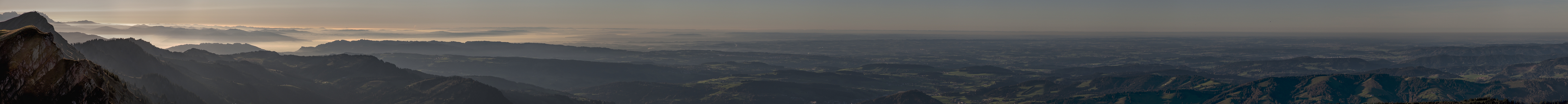 Ohne weitere Worte - einfach nur genial dieser herrliche Nachmittag und Abend in der Nagelfluhkette ... Nikon D300s, AF-S Nikkor VR 16-85mm - 26 QF-Bilder, Freihand Uhrzeit: 17.39 Uhr (1. Bild) Blende: f/9 Belichtung: 1/320 - 1/125 ISO: 100 Brennweite: 85mm (KB 128mm) Crop ca. 20% LR 5.7, PTGui Pro, IrfanView, U. Deuschle Eigentlich wollte ich das Panorama nach rechts noch um einige Bilder fortsetzen, aber bei den rechten Begrenzungsfelsen unterlief mir ein handwerklicher Fehler, sodass die Unschärfe gewaltig stören würde ... |