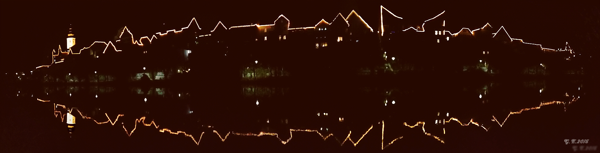 Jedes Jahr im Advent werden die Dächer der Häuser von Frohnleiten und teilweise auch die Hausfluchten auch am Mur Ufer mit Lichterketten nachgezogen und diese spiegeln sich dann im Wasser, da die Mur hier gestaut ist. Das Licht ist nicht besonders hell und ich hatte nur mein Handy dabei, hoffe dass ich aber trotzdem etwas der Stimmung zu euch rüber bringen kann... Wie es bei Tag aussieht seht ihr hier: http://www.panorama-photo.net/panorama.php?pid=17137. Liebe Grüsse Samsung SM-G900F (S5), 9 HF-Bilder (JPG), freihändig, ISO 400, 1/50s, F/2,2, Brennweite: 5 mm (= 31 mm KB), Hugin, Gimp, IrfanView,..., Aufnahmedatum und -zeit: 6. Dezember 2015, 17:58 Uhr MEZ (1.Bild). |
