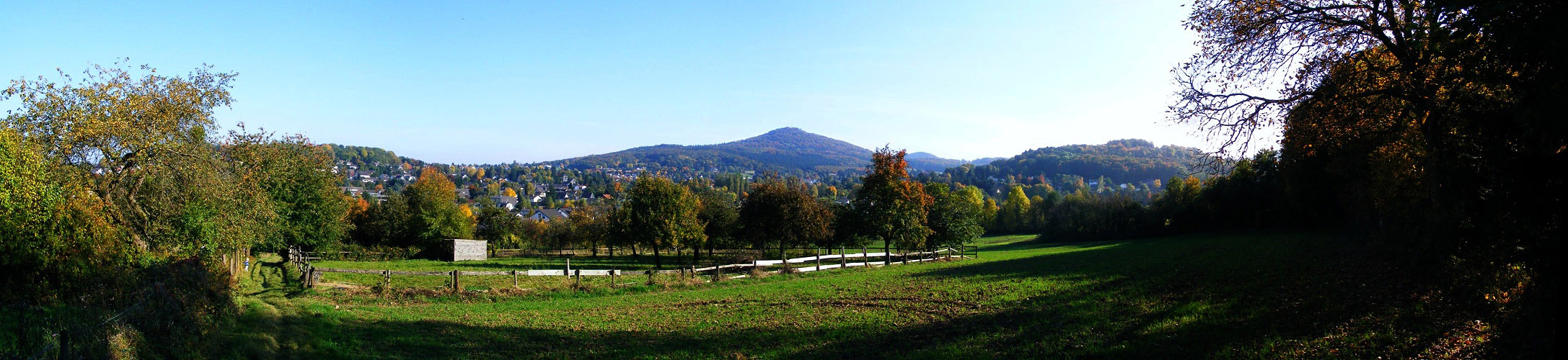 Farbenfrohes Pleiser Ländchen am Nordfuß des Siebengebirges. Dessen vulkanischen Ursprünge sind an den Bergformen gut zu sehen, im Bild der Große Ölberg, 461 m.