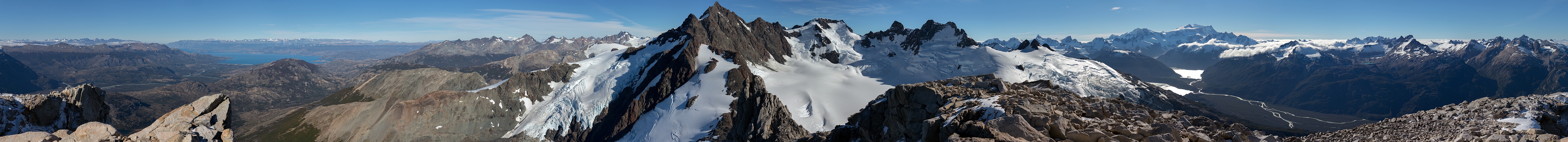 I continue the recuperation of old Patagonian panoramas with what was, from a documentary point of view, one of the staples of the series. The original title sounded "SanValentín:2-2", highlighting the fact that the elevation of the summit here is "only" one half of what lies on the other side of the valley, and on the east margin of the Hielo Norte: namely, the San Valentín, highest mountain of the Patagonian Andes. A remarkable feature of this panorama is that, with a certain attention, you are able to spot inside it also the beautiful profile of the San Lorenzo, with 3706 m ranking second in that classification.