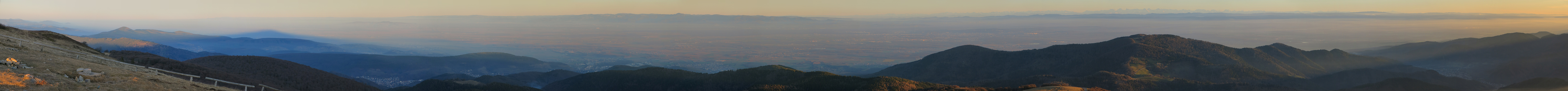 Noch ein Blick mit höherer Brennweite vom Grand Ballon Richtung Schwarzwald und Alpen kurz vor Sonnenuntergang. Die Aufnahmen entstanden am Denkmal der Blauen Teufel. Eigentlich wollte ich zum Tagesende noch einmal aufs Radom, doch als sich abzeichnete, dass die Sonne unspektakulär und verschwommen hinter aufziehenden Wolken untergehen würde, blieb ich, wo ich war. Es war schon ein phänomenales Erlebnis, die Schatten wachsen und das Licht schwinden zu sehen. Später tauchten dann auch noch tausende Lichter in der Ebene auf und der Mont Blanc zeichnete sich noch lange messerscharf am Abendhimmel ab. Das verzögerte meine Abfahrt ins Tal mit dem Rad erheblich. Irgendwann musste ich dann aber doch los - mit Licht. Brauchte ich hinauf knapp 3 Stunden ging es hinab in gut 30 Minuten nach Willer-sur-Than und in gut 3 Stunden mit dem Auto nach Hause. Ein schöner Jahresabschluss und mein letztes Pano aus 2015. Es war ein gutes Jahr und ich kann mit ziemlicher Sicherheit sagen, dass 2016 daran nich heranreichen wird.