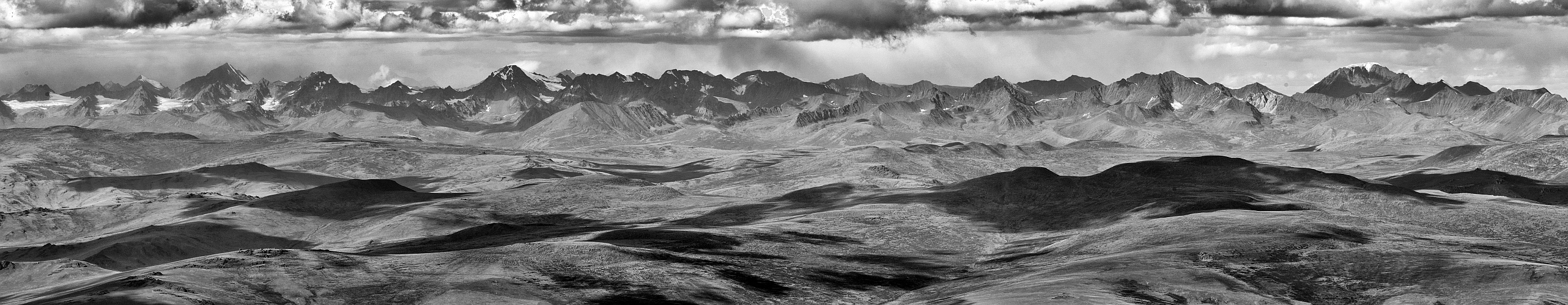 Barely visible in the quoted panorama, they pop out better in this BW rendering of a tele-pano shot the previous day, also because thick clouds rule out the summits of the Severno Chuyskyi Khrebet lying just behind.