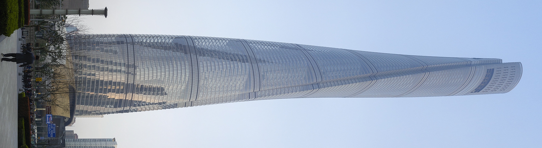 Intro 2: Selber Tag wie das zuletzt gezeigte Pano (Red Gate am Tai Shan - 684km Luftlinie, über 800km Bahnfahrt), Sprung von Tradition in die Hypermoderne. Schnellzugfahrt nach Shanghai Hongqiao (Flughafen und Bahnhof in einem) und U-Bahn-Fahrt in die Stadt. Tritt man an der East Nanjing Road aus der U-Bahn, erwartet einen eine belebte Fußgängerzone mit H&M und GAP gegenüber und dem Apple Store links - eine Art inverser Kulturschock - sieht aus wie daheim. Nach Quartierbezug fuhren wir eine U-Bahn Station weiter nach Lujiazui in Pudong ("östlich des Flusses Pu"). Noch ein Kulturschock - sieht aus wie Dubai, nur feuchter. Der Turm besteht aus einem inneren Kern und einer äußeren Schale. Entgegen der ursprünglichen Intention des Architekten sind die Bereiche dazwischen nicht als "sky lobbies" öffentlich zugänglich. Die gewundene Kerbe wird abends von leuchtenden laufenden Schriftbändern verziert - Pudong@night zeige ich noch. Mehr auf https://en.wikipedia.org/wiki/Shanghai_Tower Eine Supervideo vom Bau und der sich entwickelnden Umgebung ist https://www.youtube.com/watch?v=4sCMGhVX5Ts Und für alle, denen ihr Leben zuwenig aufregend ist: https://www.youtube.com/watch?v=gLDYtH1RH-U Olympus OM-D E-M10 M.Zuiko 14-42 EZ @26mm (=52mm KB) mit Crop 10 QF RAW freihand, ISO 200, 1/200, f8 Lightroom CC, Autopano Giga 4.4.0, IrfanView PS: In China ist das Koordinatengitter bewusst verzerrt. Google Maps passt nicht ganz zu den Satellitenbildern. Ich verorte nach letzteren.