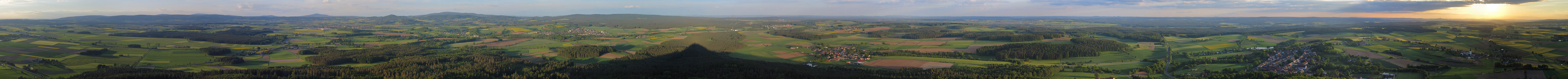 Der Rauhe Kulm war mir schon auf unzähligen Panoramen aus der Umgebung aufgefallen und stand auf meiner To-Do-Liste recht weit oben. Leider liegt er für gewöhnlich außerhalb meiner Reichweite. Aber in diesem Jahr verbrachten wir ein verlängertes Wochenende in Bayreuth. Auf der Herfahrt war das Wetter schlecht und ich hatte nicht erwartet, dass dieser Kurzurlaub im Hinblick auf Panoramen ergiebig werden würde. Während der Stadtbesichtigung wurde das Wetter dann zusehends besser und nach einem frühen Abendessen drängte ich noch zu einer Ausfahrt in die Umgebung. Von Bayreuth sind es etwa 25 Fahrminuten bis nach Neustadt am Kulm, wo der Aufstieg beginnt. Für diesen brauchten wir dann noch einmal 30 Minuten, wobei wir den kürzesten Weg in der Eile nicht gleich fanden. Der Aussichtsturm auf dem Rauhen Kulm bietet eine interessante Aussicht in alle Richtungen, weshalb für mich nur ein 360°-Panorama infrage kam, obwohl es schon kurz nach 7 war und die Sonne nicht mehr so ideal hoch für mein Vorhaben stand. Zwischen der ersten und letzten Aufnahme liegen 20 Minuten. Das ist ungewöhnlich lang und in einem endlosen 360°-Viewer könnte man das Bild so nicht zeigen, da Anfang und Ende zu unterschiedlich sind, um sie zusammenzufügen. Hier bei p-p.net geht es aber ganz gut, denke ich. Für den etwas überstrahlten Himmel am Schluss hätte ich noch eine retuschierte Version. Ich habe jetzt erstmal die authentische hochgeladen.