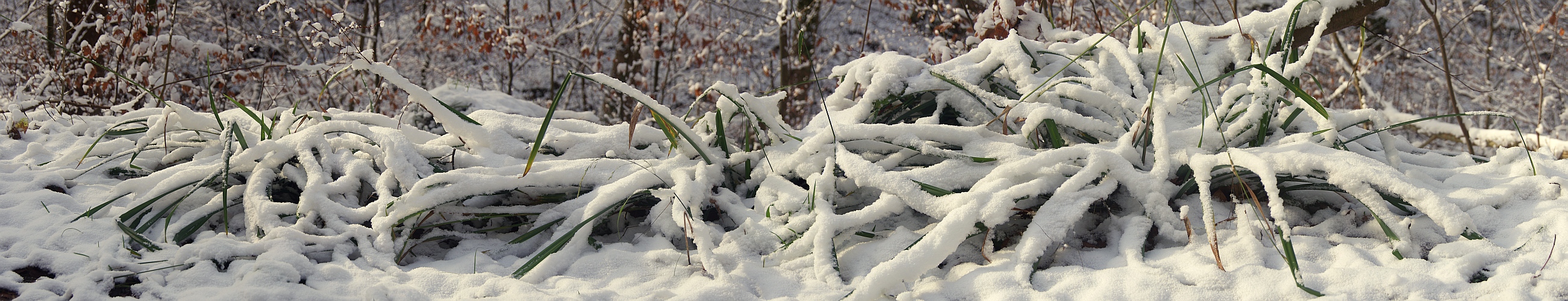Eine auffällige Grasart, die oft feuchte Waldwege begleitet, ist die Hängende Segge (Carex pendula). Sie behält als atlantische Art ihre breiten grünen Blätter auch "im Winter, wenn es schneit" und scheint mir deswegen ein geeignetes Motiv für die Weihnachtszeit zu sein.