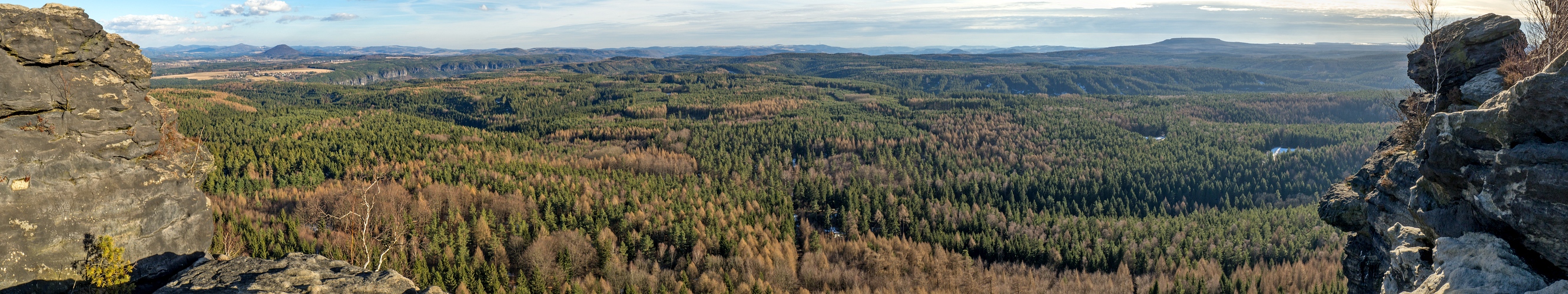 In meinem Panorama Nr. 5992, das ich mal in der Gegenrichtung vom Hohen Schneeberg aus gemacht hatte, sieht man noch etwas mehr von dem großen Waldgebiet des Elbsandstgeingebirges, weil es sich auch noch nördlich vom Großen Zschirnstein teilweise bis zur Elbe erstreckt.