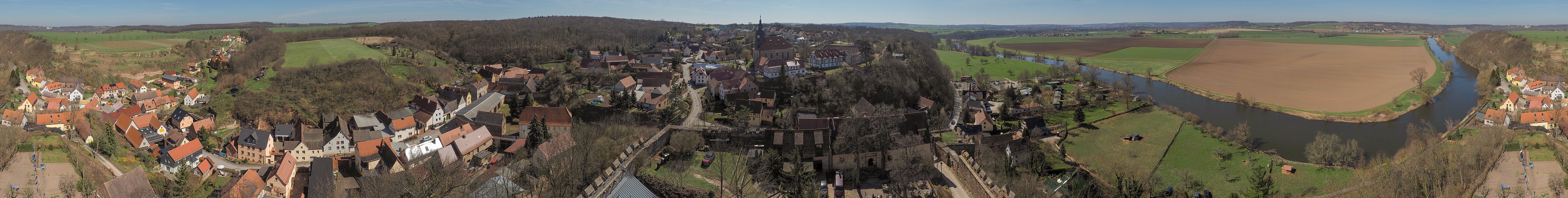 Direkt an einem 90°- Bogen der Saale liegt der kleine Ort Schönburg. Von der gleichnamigen Burg ist dieses Pano.