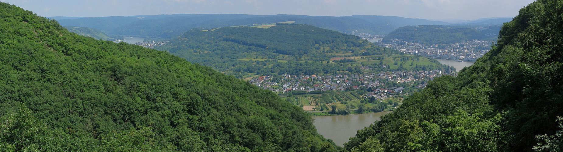 Den Vierseenblick bei Bremm an der Mosel zeigte ich vor zwei Jahren (Nr. 20526). Am Rhein bei Boppard gibt es noch einen. Da er in unserer Sammlung noch fehlt, zeige ich ihn heute. Die bekannte große Rheinschleife ist von hier aus in vier Teilen zu sehen, weshalb der Aussichtspunkt zu seinem Namen kam. Der Blickwinkel und auch die Aussichtstelle selbst sind recht klein. Im Grunde hat man nur von der Terrasse des gleichnamigen Ausflugslokals diesen Vierseenblick. Daher verbanden wir die Aufnahmen mit einer Einkehr in den Biergarten dort. Einen ununterbrochenen Blick auf die gesamte Rheinschleife bietet der Aussichtspunkt am Gedeonseck höchstens 10 Gehminuten weiter. Dort waren wir anschließend auch. Da er aber schon bei besseren Bedingungen gezeigt wurde als bei unserer Wanderung von der Mosel an den Rhein, überspringe ich ein neues Panorama von dort.