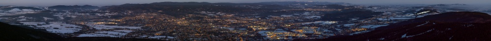 Nachdem ich den Sonnenuntergang genossen und fotografiert hatte (Pano #21201), wendete ich mich nun nach Osten. Auch hier war die Sicht trotz zunehmender Dunkelheit noch gut und reicht schwach bis zum Adlergebirge und auch der Blick in die etwa 625m tiefer liegende Stadt ist beeindruckend.