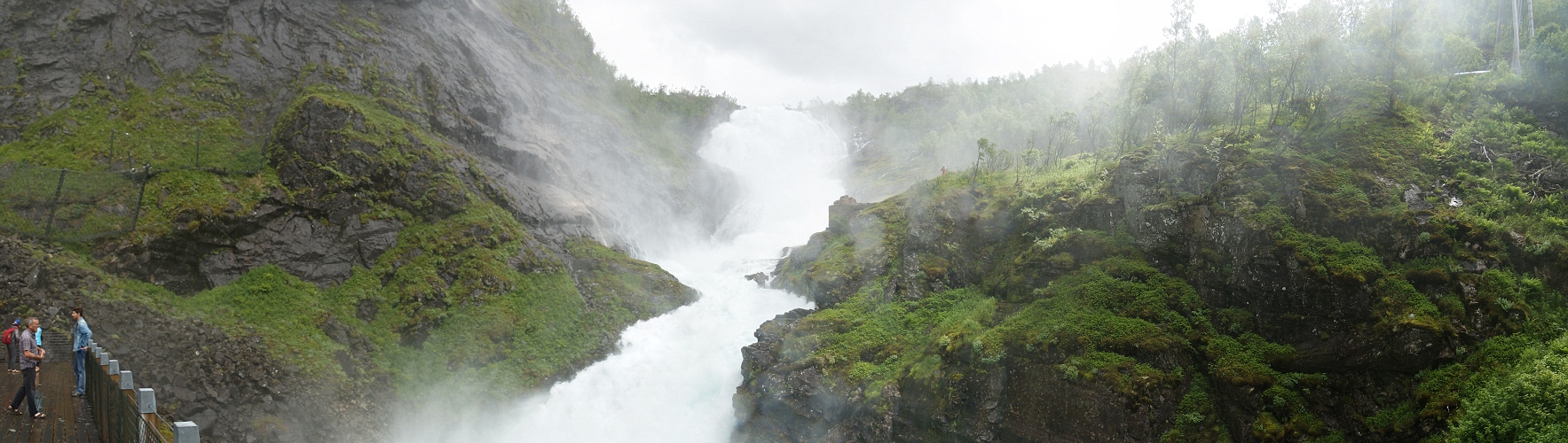 Wenn man auf der norwegischen Bergenbahn im Bahnhof Myrdal aussteigt und von dort aus mit der Flåmsbahn hinunter zum Aurlandsfjpord fährt, dann legt der Zug in der Sommersaison regelmäßig einen Fotostopp unterhalb des Wasserfalls Kjosfossen ein.