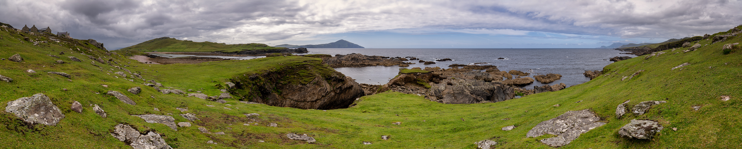 Wer eine besonders raue Dosis Meerluft möchte fährt auf Acaill. Hierher verirren sich keine Touristenmassen und die Schafe stehen mitten auf der Straße und denken gar nicht daran, einem Auto Platz zu machen. Wir nahmen den Atlantic Drive, eine beschilderte Küstenstraße, die in Achill Sound (Gobh an Choire) beginnt und hinab bis an die Südspitze von Acaill führt. In Cloughmore macht die Straße eine scharfe Rechtskurve und die bis dahin ruhigen Wellen des Achill Sound, einem fjordähnlichen Einschnitt, werden von der rauen Brandung des Atlantik abgelöst. Direkt gegenüber von Cloughmore, abgetrennt durch ein schmales Gewässer, den so genannten "Blind Sound", befindet sich die Insel Achillbeg, die seit den Sechzigerjahren nicht mehr bewohnt ist. Das Wetter wurde im Laufe des Tages immer besser und es boten sich uns immer wieder spektakuläre Küstenaussichten.