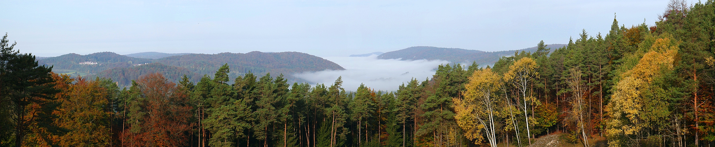 Vor über 4 Jahren habe ich von derselben Stelle schon einmal ein Panorama mit Frühlingsschnee gezeigt (#17340). Diesmal eine Herbstimpression mit der in der Fränkischen Alb mit ihren geringen Höhenunterschieden seltenen Erscheinung des Talnebels bei freien Bergen.
