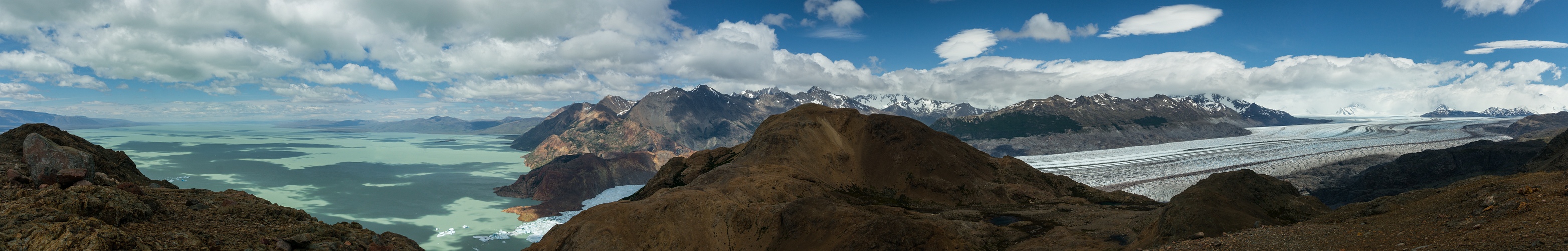 Oben am Pass angekommen, erwartete uns der mit Abstand heftigste Wind, den wir in Patagonien erleben durften. So stark, dass er einen locker aus dem Gleichgewicht bringen konnte. Ich deponierte meinen Rucksack an einem windgeschützten Platz und rannte (mit viel Rückenwind) hinauf zu diesem Aussichtspunkt, von wo aus man einen sagenhaften Blick auf einen der größten Seen Argentiniens auf der einen Seite und einen der größten Auslassgletscher des Campo de Hielo Sur auf der anderen Seite hat.