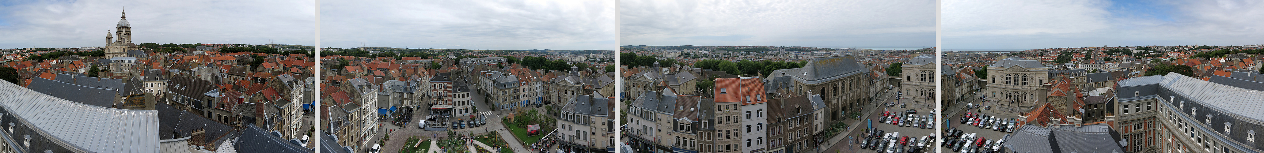 Einen Tagesausflug nach Boulogne haben wir uns nicht nehmen lassen. Die Stadt hat über 40.000 Einwohner und da kann man sich natürlich nicht alles ansehen. Wir beschränkten uns auf die Altstadt, die komplett von einer Stadtmauer umgeben ist. In der Mitte befindet der Belfried (Glockenturm). Er kann im Rahmen einer Führung (zu der man sich kurzfristig anmelden kann) bestiegen werden. Über den Glocken auf etwa 2/3 der Gesamthöhe befindet sich eine Aussichtplattform mit quadratischem Grundriss, die ein hindernisloses 360°-Panorama über die Stadt ermöglicht, welches aber nur mit allergrößten Schwierigkeiten zu fotografieren ist. Die Aussichtplattform ist nur wenig höher als die dicht umgebende Bebauung und durch die nötigen Standortwechsel auf den Belfried ergeben sich große Parallaxenunterschiede. Eine höhere Brennweite ist keine Lösung. Die Kathedrale ist Hauptattraktion des Ausblicks. Sie muss ganz ins Bild und da hat man mit mehr Zoom zwar keine Stitchprobleme im Nahbereich aber auch viel zu viel Himmel. Also habe ich mich für eine Weitwinkelversion entschieden. In einem Stück haben aber weder PanoramaStudio noch ich das fehlerfrei hinbekommen. Mit viel Tüftelei und Nacharbeit wäre es vielleicht möglich, aber dazu fehlen mir momentan Lust und Zeit, zumal Motiv und Wetter sowieso keinen allzu großen Zuspruch in Aussicht stellen würden. Also habe ich mir erlaubt, das 360°-Panorama etwas unorthodox in 4 Teilen zu präsentieren.
