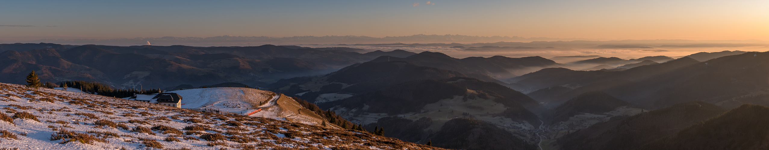... aber ich finde die beiden Werke ergänzen sich gut, zeigen diese doch auch die unterschiedlichen Schwerpunkte, die wir als Fotografen bei unserem spontanen Treffen abends am Belchen gesetzt haben. Als wir am Gipfel ankamen und Jens begrüßten, hat sich dieser schon "dick vermummt" ;-) im eisigen Wind mit Stativ für die langen Serien in den unterschiedlichen Lichtstimmungen eingerichtet. Ich stapfte danach meines Weges um das so herrlich gelegene Belchenhaus und den tiefen Blick ins Wiesental mit dem Alpenbogen am Horizont in ein erstes Motivpanorama auf den Sensor zu bringen, bevor auch ich das Stativ für einen längeren Schwenk aufbaute - hier das Ergebnis.