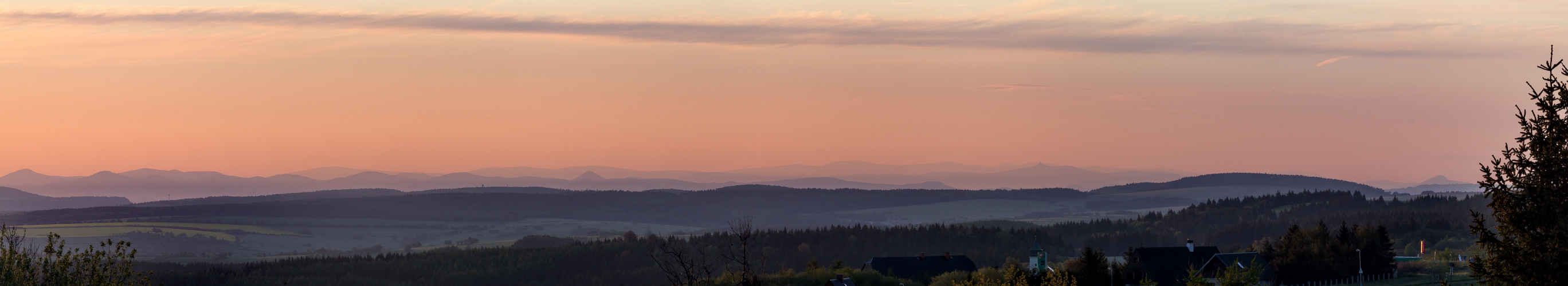 Ursprünglich hatte ich ein Pano mit 600mm Brennweite ausgearbeitet. Mit 150mm schien es mir aber das die Verhältnisse realistischer wiedergegeben werden: die Sicht war gut, aber verschleiert. Ungefähr so, wie das man ins Nachbarland weit sehen kann, aber nicht über die Grenze darf. Zuerst führte mich mein Weg auf den kleinen Lugstein von dem ich zwar wusste, dass nach Osten einige Birkenwipfel stören. Inzwischen ist es aber so schlimm, dass für ein Tele Richtung Ost der Standort völlig unbrauchbar geworden ist. Also bin ich zurück in die Nähe der Aussichtstafel bei der Wetterstation wo es mir gelang wenigstens ein 20° breites Fenster ohne Äste und die Sicht verdeckende Häuserdächer zu erwischen.