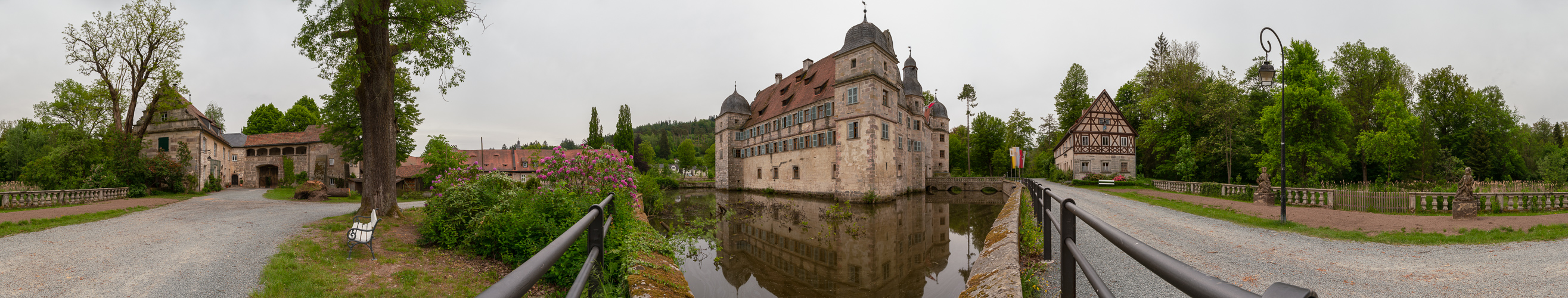Vom Wetter her stand der Besuch des Wasserschlosses Mitwitz unter keinem guten Stern. Am Aufnahmetag zog eine monotone Stratusbewölkung auf, die fast keine Struktur in sich hatte. Gravierenderenden Einfluß auf das Renaissance-Ensemble hatte jedoch ein Sturm, der wenige Tage zuvor eine große Eiche umriss, deren Stamm die Ufereinfassung des Wassergrabens beschädigte. Die Krone des Baumes war noch nicht geborgen. Das Loch des Wurzelstockes war weiträumig abgesperrt. Das Flatterband konnte in der Bildbearbeitung glücklicherweise gut retuschiert werden.