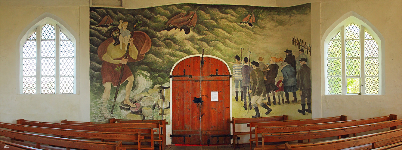Nach zähen Verhandlungen zwischen dem Pfarrer der Gemeinde und seiner Kirchenleitung hatte diese endlich Mitte der 80er Jahre die Erlaubnis erteilt, daß dieses Wandgemälde mit einer sehr weltlichen Darstellung des Christophorus-Motivs von dem in Berlin wirkenden italienischen Maler Gabriele Mucchi (1899-2002) in der kleinen Kapelle angebracht werden kann. Gabrielle Mucchi hat dann noch mit über 90 Jahren auf dem Gerüst gestanden und sein Werk "Menschen im Sturm" an die Wand gebracht. 1990 war es dann endlich fertig - und auch der Pfarrer der Gemeinde war froh. Könnte sein, daß er deshalb froh darüber war, das es jetzt in der Kapelle dieses Gegenüber zu dem düsteren Altarbild, einer Kopie von Philipp Otto Runges "Christus rettet den versinkenden Petrus", gibt.....