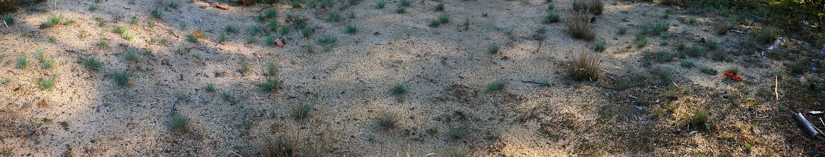 Manche Bereiche in den Mittelfränkischen Sandgebieten sind fast vegetationslos infolge der Niederschlagsarmut und oberfächlichen Austrocknung der Sande. Es gibt aber Spezialisten, die hier wachsen können, wie im Bild der Haar-Schwingel (Festuca filiformis), der teilweise beschattete Standorte bevorzugt.