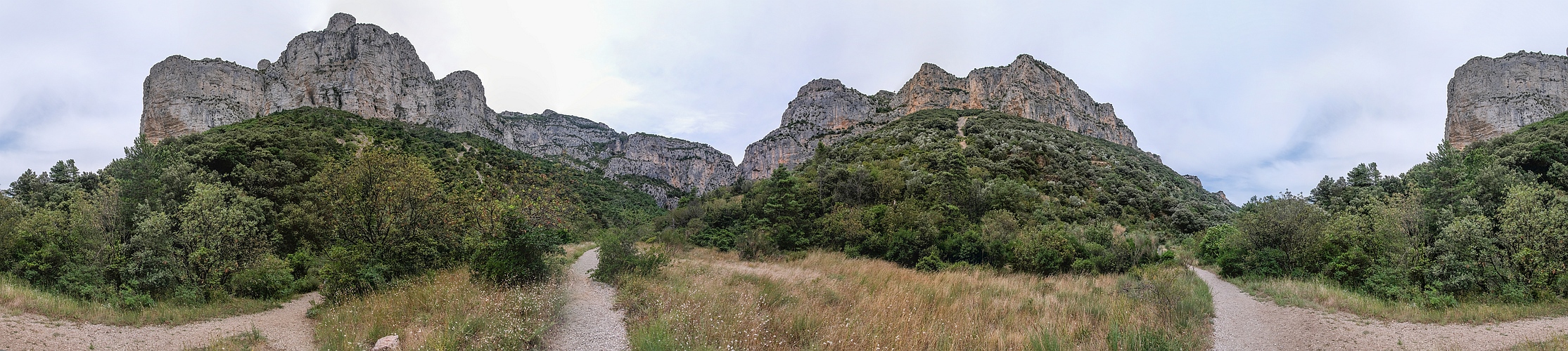 Zu den beeindruckendsten Landschaften des Languedoc zählen die Abstürze der Cevennen zum Tal des Hérault hin - im gleichnamigen Département. Oberhalb des überaus pittoresken Touristen-Hotspots Saint-Guilhem-le-Désert führt ein breiter Weg am Flüsschen Verdus entlang zur sog. Source du Bout du Monde, der Quelle am Ende der Welt. Hier bilden die senkrecht aufsteigenden Wandfluchten keinen unmittelbaren Durchstieg. Das Bild hier ist noch mit einigem Abstand zu dem eigentlichen Talschluss aufgenommen.