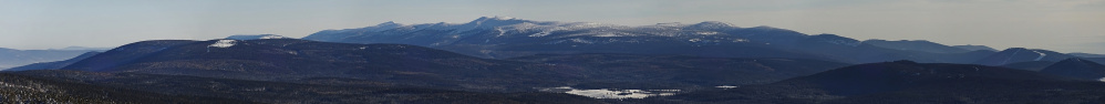 Das Riesengebirge ragt deutlich aus dem Waldmeer der Sudeten heraus. Im Bild der Hauptkamm mit der wenig gegliederten polnischen Nordseite. Im Vordergrund erstrecken sich die sanfteren Höhen des Isergebirges mit der Großen Iserwiese (Hala Izerska) in der Mitte.