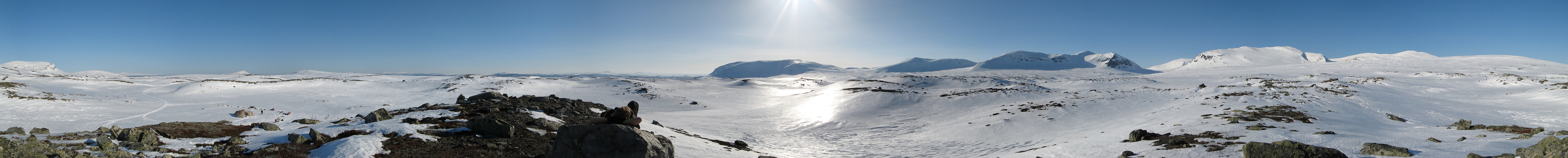 Vor vielen Jahren hatte meine Frau die grandiose Idee eine Husky-Tour in Schweden zu machen. Es wurde eine unserer interessantesten und schönsten Reisen. Die Gruppe bestand aus einem Musher mit 40 Huskies und 6 Schlitten sowie 3 Männern und 2 Frauen als Hundeschlitten-Anfänger. Jeder bekam sein Team bestehend aus 6 Huskies, was auch eigenständig versorgt wurde. Nach dem ersten Kräftemessen zwischen Mensch und Schlittenhund freundeten wir uns schnell mit unseren Vierbeinern an. Wir machten diverse Touren im tief verschneiten Umland. An diesem Tag ging es in die Berge. Nachdem die Huskies die Schlitten samt Passagieren und Gepäck bis ins Hochfjäll gezogen hatten, war erst einmal Erholung angesagt. Aber beim Anblick der Berge gab es für mich kein Halten mehr. Ich nutzte spontan die Gelegenheit und stapfte nach diesen Fotos zu Fuß weiter bis auf den nächsten Berggipfel (siehe Pano vom Mossalassfjället).
