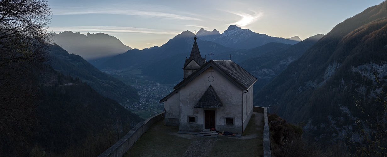 The lower Primiero valley is curiously warded, from opposite sides, by two scenically placed monuments. On the NE side one finds Castel Pietra, the stronghold of the Welsperg family, presented in N.20263. On the SW side one finds the little white church of San Silvestro, perched above a vertical cliff of Monte Totoga. It seems to have been built well before the XIV century. Since it is nearly impossibile to find it open, I never saw its interior, featuring several frescoes. But for once I wanted to see the sunrise from here, and that is why one sees the sleeping bag laid down right in front of the church. I could not imagine that the sun would rise exactly from the point where the W bank of the Sass de Mura intersects the SW ridge: I had been there right three days before, and with the aid of Carl Zeiss I was even able to photograph the footsteps on the snow.