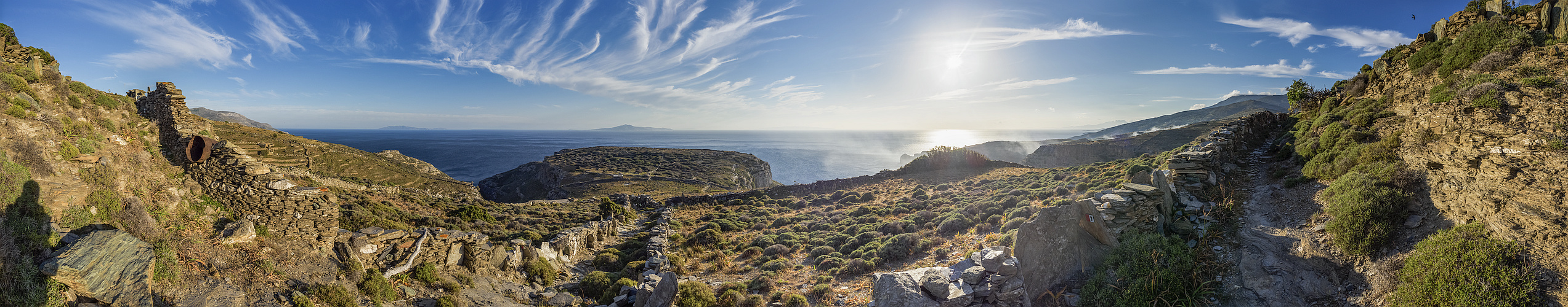 Das letzte Ziel an diesem Tag waren die hoch über dem Meer gelegenen Ausgrabungen von Zagora, einer Siedlung aus dem 9.-7. Jh. v. Chr. Dies bescherte mir noch einmal eine kleine, gut einstündige Wanderung im Abendlicht auf gut markiertem Weg von der an der Straße gelegenen Kapelle Agia Triada. Man läuft durchwegs zwischen den typischen kykladischen Mauern. Hier gut zu sehen der charakteristische Stil, alle paar Meter einen großen flachen Stein senkrecht einzubauen. Mehr dazu auf https://de.wikipedia.org/wiki/Zagora_(Andros) oder http://zagoraarchaeologicalproject.org/. Die Funde sind ganz hervorragend im Archäologischen Museum der Chora (Pano #31402) ausgestellt und erklärt.