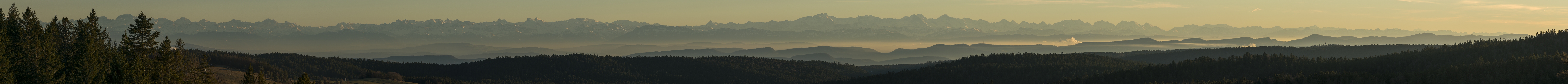 Vom merkwürdigen Namen dieses Aussichtspunkts hatte ich schon berichtet und vom Blick nach Norden ein Pano gezeigt (Nr. 23249). Hier nun der Blick Richtung Süden mit dem Alpenpanorama, das im Vergleich zu anderen Aussichtspunkten im Schwarzwald aber nicht so umfangreich ist, da nach Osten zu Bäume die Sicht einschränken.