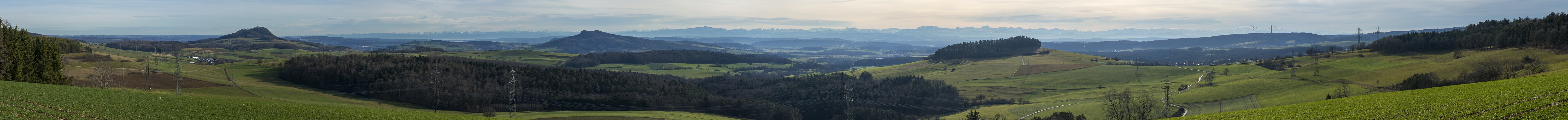 Von West nach Ost führte uns die Hegautour an Silvester. Der zweite von insgesamt sieben Aussichtspunkten war die mit dem Pkw einfach zu erreichende Spitzhütte. Die Hochspannungsleitungen verschandeln hier gemeinsam mit den Windrädern die Landschaft. Aber im Hinblick auf das was noch kommen wird und andernorts schon real ist, ist das hier ja noch ein idyllischer Ausblick.