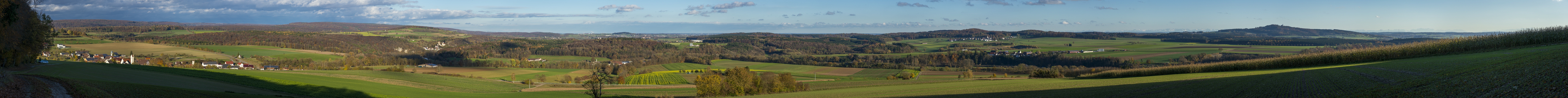 Am Emerberg gibt es zwei Aussichtsstellen. An beiden hat man Tische und Bänke aufgebaut. Im Vergleich zum bereits gezeigten Punkt hat man hier einen weiter nach Osten reichenden Blickwinkel. Dafür ist die Alpenkette von hier aus nicht vollständig zu erkennen. Durch das Maisfeld ergibt sich aber eine vernünftige Begrenzung des Sichtfelds.