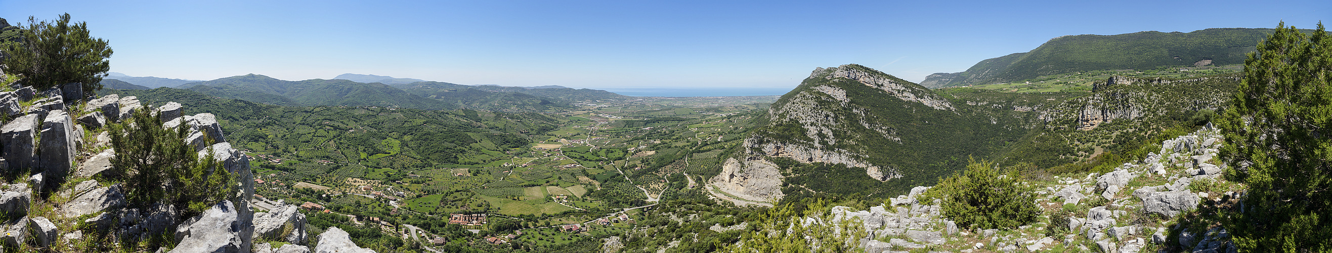 Von diesem schönen Tag zeige ich noch ein oder zwei weitere Motive - so sonnig, klar und trocken sollte es nämlich nicht die ganzen beiden Wochen meines Urlaubs bleiben. Von Paestum ist es eine kurze Fahrt ins Dorf Giungano. Etwas unterhalb des Parkplatzes am Ortseingang (Parken ist hier überall etwas, was Vorbereitung erfordert...) geht ein markierter Wanderweg bergauf ins auf der Kuppe gelegene Trentinara. Die Sicht auf den Monte Sottano, die Küste bei Paestum und in der Ferne die Amalfi-Küste weitet sich. Von oben kommen schrille Schreie - hier kaum erkennbar zieht sich "Cilento in Volo" über die Schlucht (https://www.cilentoinvolo.info/), eine Zipline, an die man sich bei einem zu langweiligen Leben am Gurt einhängen lassen und frei über die Landschaft rasen kann. Die wurde fleissig genutzt, oben im Ort war auch einiger Betrieb, nur wandern war sonst niemand.