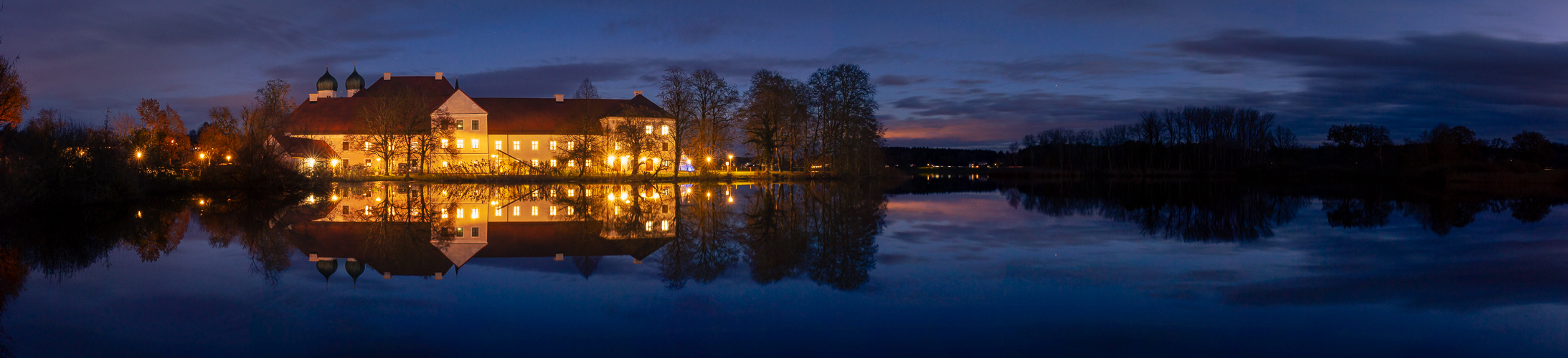 Ein beruflicher Abstecher ins bayerische Chemiedreieck führte mich am Kloster Seeon vorbei. Dank guter Verkehrslage kam ich rasch durch und erreichte das Kloster gerade so zum Ende der blauen Stunde. Auf dem ganzen Weg von Würzburg bließ der Wind böig, teils stürmisch. Nur hier, in Sichtweite und im Windschatten der Alpen, war absolute Flaute. Glück für mich, denn nur so war die perfekte Spiegelung möglich.