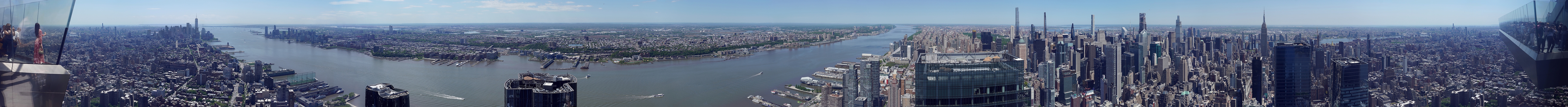 Zum Abschluss der kleinen New York Serie gibt es nun auch nochmal etwas Vordergrund. Vom Innenraum der Edge kann man auch seitlich auf die dreieckige Plattform schauen. Besonders beliebt sind die Ecken, der Glasboden mit Tiefblick und die Treppe, von wo aus die einzige Chance besteht auch ohne dicke Glasscheiben auf ein Stück der Skyline zu schauen. Als ich von da nur 5 Minuten lang eine Hochformat-Serie gemacht habe, wurde ich schon von einem spanisch sprechenden Menschen angepöbelt, warum das so lange dauert. Ein schnelles Selfie oder Bild der Liebsten reicht schließlich aus. Für Panoramen ist die Außenplattform sonst weniger geeignet, denn die spitzen Glasecken sind fotografisch gewissermaßen tote Winkel. Von innen geht das etwas besser, allerdings mit vielen Reflexionen. Ganz links im Bild habe ich die mal gelassen. Ansonsten ist es etwas aufwendig die Bilder digital zu entspiegeln.