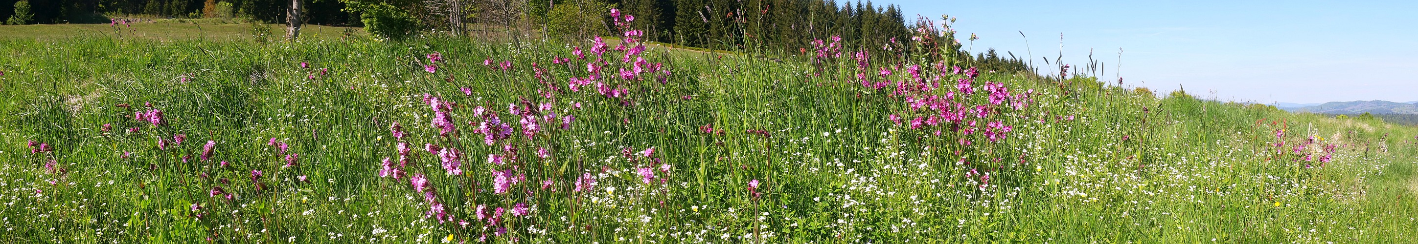 Die oft kräftig rot gefärbte Rote Lichtnelke (Silene dioica) gehört zu den wenigen Wildblumen, die meiner Meinung nach häufiger werden. Sie kann auch ganze Brachfelder erobern. Im Bayerischen Wald war sie schon immer sehr häufig. Die kleinen weißen Blüten im Bild gehören zu Hallers Schmalwand (Arabidopsis halleri).