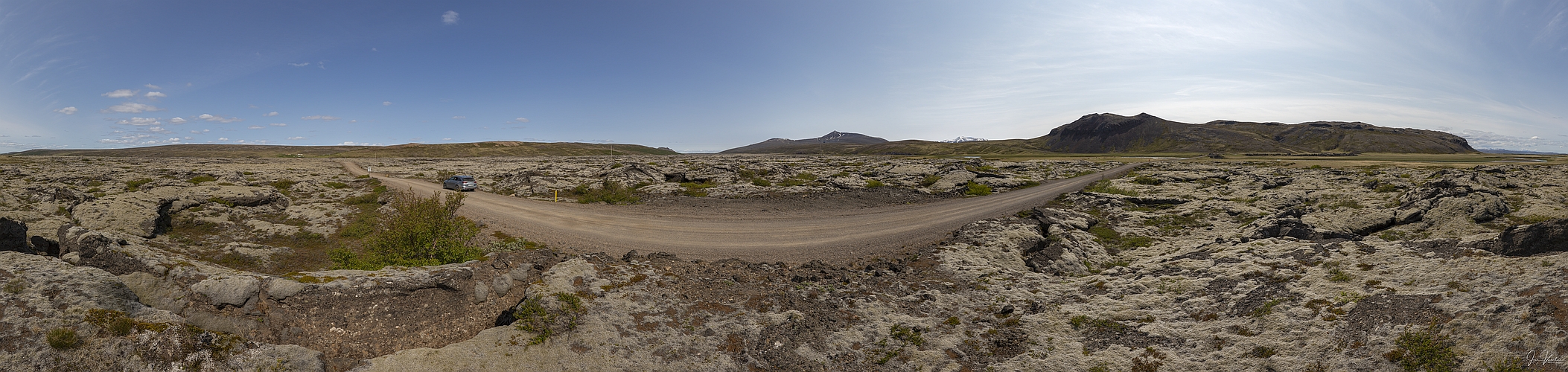 Mitten durch dieses Lavafeld führt die Schotterstraße 523, die wir von Húsafell wieder zurück in Richtung Westen nahmen. Die geologische Besonderheit dieses Feldes ist, dass es aus Basaltlava besteht, die wiederum aus sehr heißem, dünnflüssigem Magma entstanden ist. Bei deren Abkühlen bildet sich ein Strickmuster an der Oberfläche, weshalb die Lava auch als Stricklava bezeichnet wird. Auch hier lohnt ein kurzer Blick auf das Luftbild, bei dem die Strukturen und auch das Ausmaß des Feldes noch besser zur Geltung kommen.