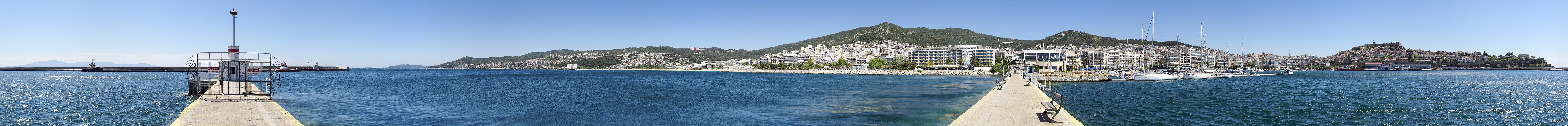 I can only show the view of Kavala from the harbour pier on the outward journey towards Thassos – on this windy day, I stopped there for an hour to orient myself before continuing on to Keramoti by bus. I went back here on the return journey, but unfortunately ruined the series by missing a section. The location of the old town on a peninsula off the coast, with the castle at the top, is clearly visible.