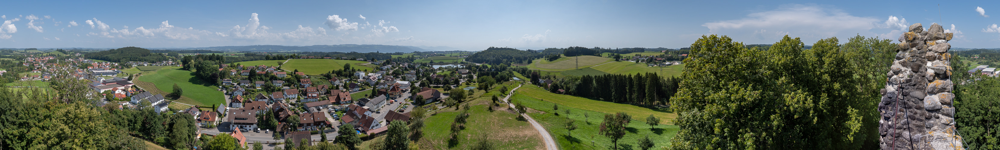 Ein neuer Standort in unserer Panoramawelt wollte erkundet werden. An einem wahrlich schwülheißen Tag trieb es mich die Stufen hoch, die im Rahmen der letzen Erhaltungsmaßnahmen dieses Burgfriedes aus dem 13. Jahrhundert eingebaut wurden. Bei leibe kein Fernsichttag, wobei sich hier bei besseren Bedingungen eine Wiederkehr lohnen würde. Die Schwüle des Tages entlud sich im Westen schon in ersten Gewittern, deren Wolkenschirm sich deutlich abzeichnet. Im Osten überlegen sich die ersten Cummuli gerade, ob sie emporsteigen wollen. Noch ist Ruhe, doch am folgenden Morgen öffnete auch hier der Himmel seine Schleusen.