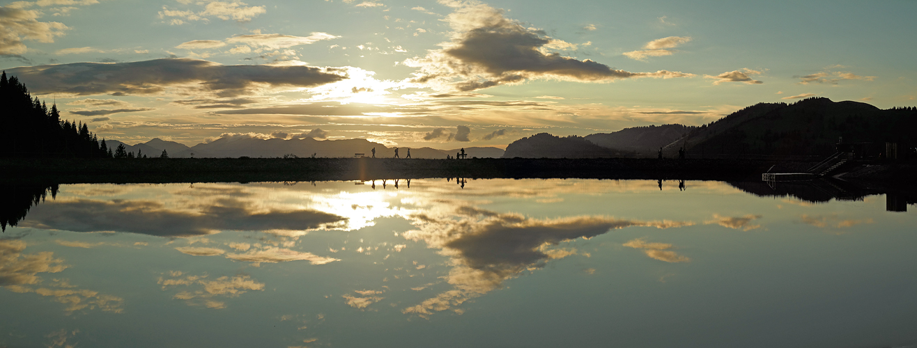 | Tagsüber war es noch bedeckt und in der Frühe regnete es sogar noch leicht. Also dachte ich mir, den Tag kannst Du knicken. Doch ab Mittag klarte es auf und wider Erwarten fand die monatliche Sonnenuntergangsfahrt auf die Wiedhagalpe doch statt. Im Laufe des Nachmittags wurde es immer besser und so ergab sich am Speichersee für die Schneekanonen plötzlich diese Stimmung. Das konnte natürlich nicht unpanoramisiert bleiben .....3 QF Aufnahmen mit Samsung NX30, bearbeitet und panoramisiert wie immer mit PSE14. Da hier die Berge eine untergeordnete Rolle spielen, habe ich es bei pp und nicht bei ap eingestellt.