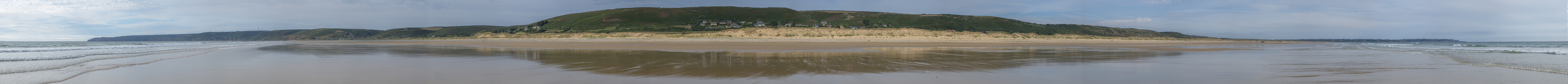 Blick zum Land vom Meer bei Ebbe - ein bei mir beliebtes Panorama-Motiv. Hier die Landschaft rund um das Réserve naturelle nationale de la mare de Vauville. Links und rechts die Atomanlagen von La Hague und Flamanville.