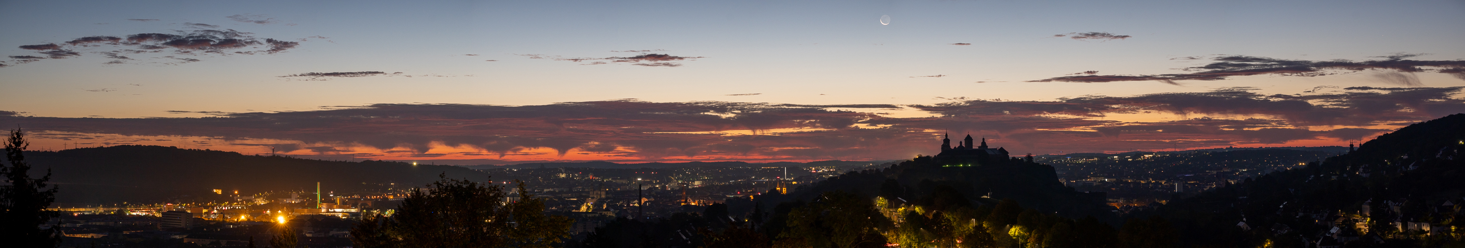Wieder einmal nutze ich die Terrasse des Hotels Wittelsbacher Höh um den Mondaufgang zu genießen. Wieder einmal spielte das Wetter nicht ganz so mit, wie ich es mir erhoffte. Wolken am Horizont verdeckten die Sicht auf die aufgehende schmale Sichel des abnehmenden Mondes, der links der Festung aufgehen sollte. Als der Mond dann endlich das Wolkenband passiert hatte begann der Himmel mit einem großartigen Farbenspiel. So versuchte ich auch hier das Optimum zwischen Mond, den Lichtern der Stadt und der Morgendämmerung zu erwischen.